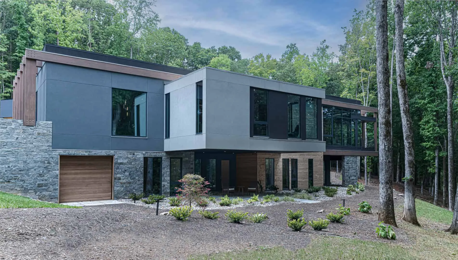 悬于山谷之上并与山丘融合,住宅成为大地的一部分,而大地也成为住宅,创造出一种全新的景观。内部和外部的空置建筑空间允许人们看到网格下方的石头、花园、原始森林、周围的树木以及支撑建筑的地基石。
