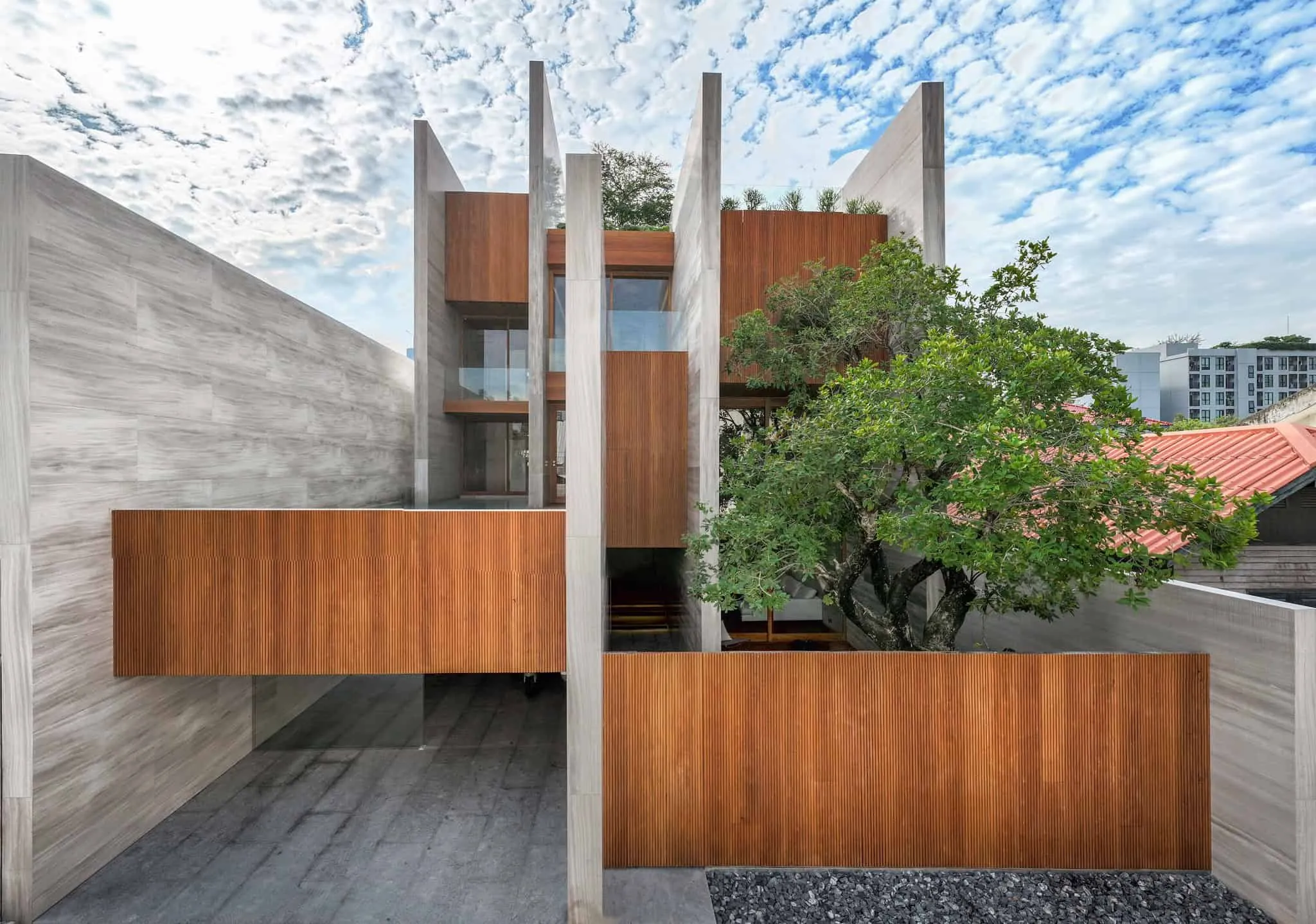 由5.5×5.5×3米模块组成的木质结构网格悬挂在核心之上,提供通行路径,并连接现有小径并创造新的路线。因此,可以通过三种不同的方式穿越这座桥梁结构:从上方(屋顶花园,延续地块)、从下方(穿过带有水镜面和天然石头的花园)以及通过住宅中部(穿越外部遮蔽区域)。该网格包含若干模块,一些被封闭空间占据;另一些则完全空置,允许花园中的树木穿过结构。
