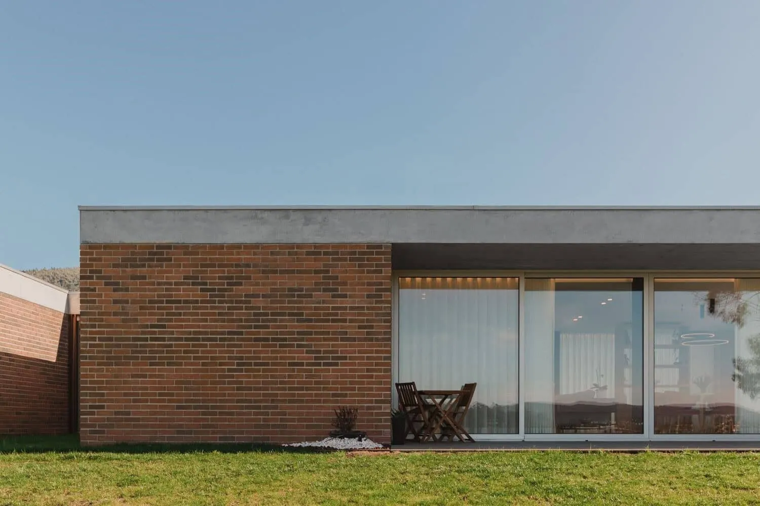 内部设计以极简的色彩搭配为基础:白色、木材和石英,让自然成为主要焦点。结构元素增添了个性——客厅中的钢制工字梁、二楼的木质屋架以及楼梯间的未加工混凝土井。浴室和走廊采用大尺寸陶瓷瓷砖与柔和色调的家具饰面,强化了整体感和简洁性。