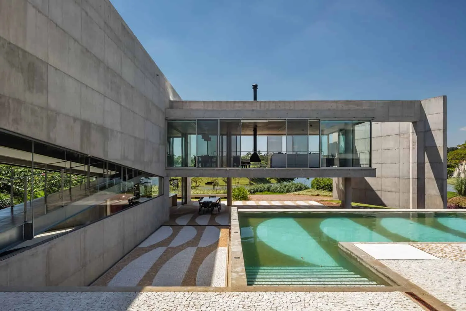 空间转变从基础柱开始。为了规划新的地下室,设计团队研究了十多个可见的柱子,包括它们的位置、高度和稳定性。新层位于3.6米到2.9米之间,利用山坡的高差实现。前部设有餐厅、休闲区和健身区,拥有最佳视野;厨房、浴室和储藏室则位于后部略低的位置。玻璃作为建筑外壳,引入大量阳光。圆形钢柱的加入解决了支撑问题,并为从上层突出的露台提供了结构基础。具有防水和吸附性能的硅藻土粘土从外墙延伸至内部空间,展现出坚硬质感与精致微调色调的美感。因此,原本粗糙的斜坡变成一个“玻璃盒子”,充满日常生活的气息,呼吸着草木的气息。