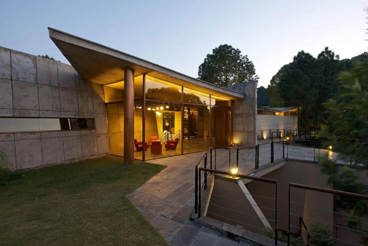 墙体所用石材取自挖掘基础和地下雨水收集池时的土方。配合必要的混凝土构件,它们共同构成了简洁的矿物建筑语言,强化了建筑的水平感和庭院的一体性。