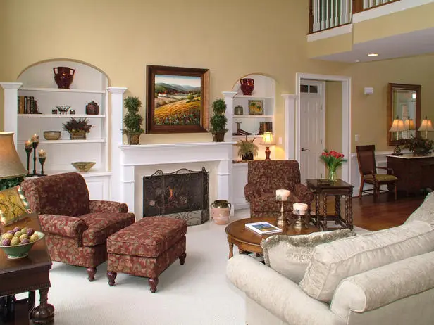 例如,在一面墙中央放置壁炉和镜子,或者电视和老式梳妆台,旁边是一个相同风格的咖啡桌,两侧则是一张沙发和两张扶手椅,均采用柔和色调。