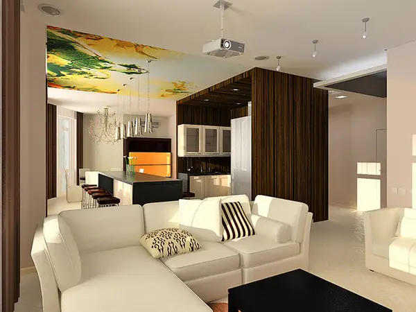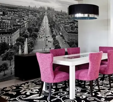 - 其次,你可以使用装饰和色彩突出用餐空间。一个与整体风格一致的不同颜色可以强调地板、墙面的一部分或天花板。你甚至可以同时做到这些。为此,可以使用壁纸(照片壁纸)、复合地板、石材、马赛克或木质护墙板。