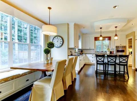 如果你的客厅有宽敞的壁龛或落地窗,你可以把用餐区放在那里。壁龛或落地窗使用餐区更加舒适和浪漫。在这样的餐厅里烛光晚餐将令人难忘。