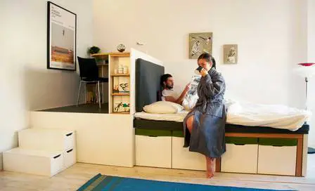 我们来实际说明一下。例如,床可以放置在平台上,需要时可拉出。剩余空间则可作为普通的客厅使用:沙发、电视、书架、茶几等。