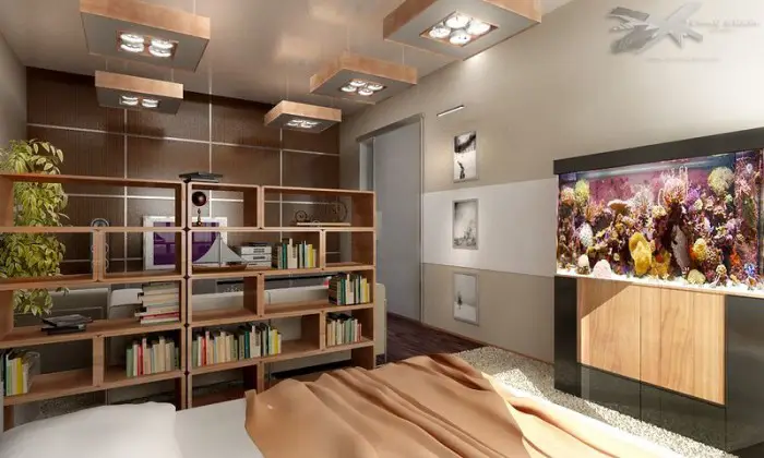 将房间划分为不同区域有多种选择。您可以选择带隔断的设计,也可以选择窗帘或书架。每种方案都有其优点。