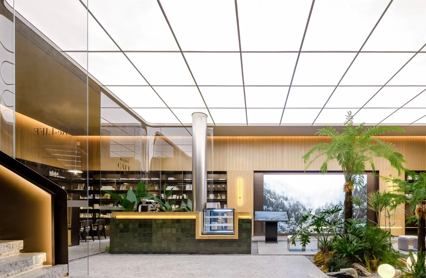 内观:明亮的木质表面环绕内部墙面,营造温暖与光线感,对抗外部黑色外壳。