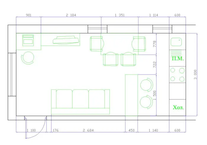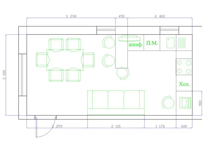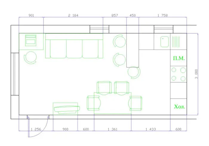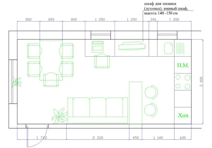 客厅设计,结合厨房:技术规范。那么我们有什么?一个小厨房和一个略大的客厅,但平方米数上没有特别的奢侈。我们想从这个设计中得到什么?——一如既往:糖果!而且是一个能容纳所有之前勉强挤进两个独立房间的物品,现在在一个被改造的空间里。