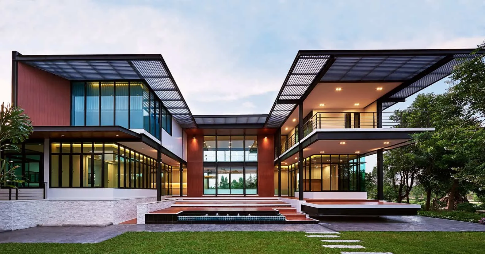 建筑平面围绕 中央体量 构建,两侧设有翼楼,包含居住区、卧室和公共服务区域。该体量朝向景观,部分区域保持内敛静谧。