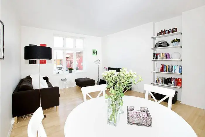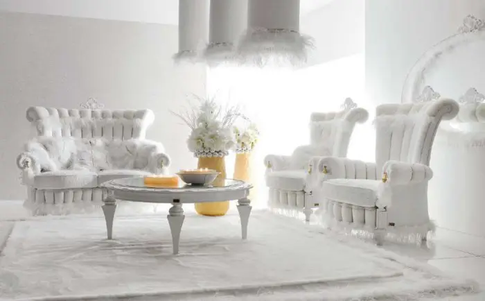 即使在装饰中存在其他颜色、色调和阴影,这样的客厅仍被视作白色。在这样的客厅里,呼吸舒适,休息也更为惬意。使用白色色调的另一个例子是现代室内设计。