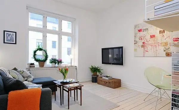 角落沙发或由坐垫制成的沙发床是沙发和扶手椅组合的良好替代方案。窄而高的衣柜或顶到天花板的架子适合小客厅。桌子、梳妆台和边桌在这种小房间里是不必要的。只允许一个小型桌子,最好也是可转换的。最好将技术设备嵌入壁龛或衣柜中以节省空间。