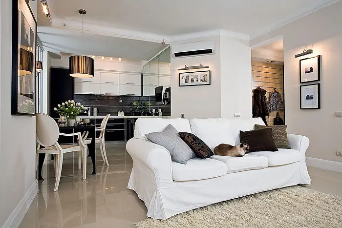尽管拆除隔断已经流行了很久,但对于许多人来说仍然不寻常且非标准。然而,这确实是解决小空间问题的真正方案。由于厨房区域的特定用途,最佳方法是将厨房与客厅结合,特别是对于很少在家做饭的人。
