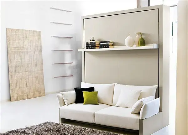 客厅里的床——如果客厅与卧室结合且有足够的空间来组织完整的卧室区域,这是常见的情况。为客厅选择的床不仅限于普通床:对于与卧室结合的客厅,平台床、之前提到的沙发床(折叠式沙发)或带衣柜的床也可以适用。