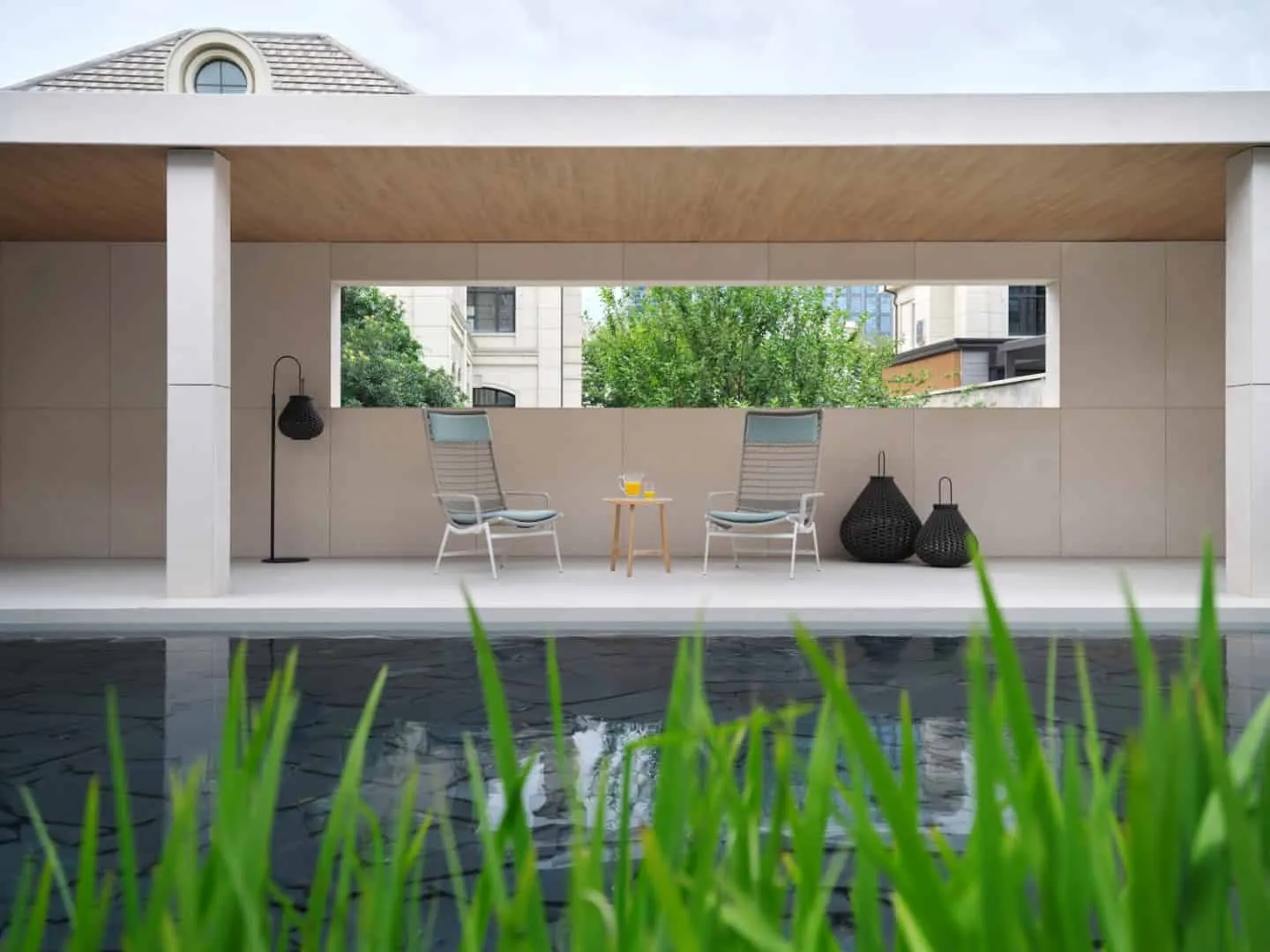决定将房屋设计成U形,围绕着游泳池和斯汀克伍德树的开放侧。南翼作为生活空间,北翼作为卧室/浴室,最大限度地利用冬季短暂的阳光。西侧连接部分则阻挡低角度西晒阳光,作为公共街道与私人庭院之间的屏障。