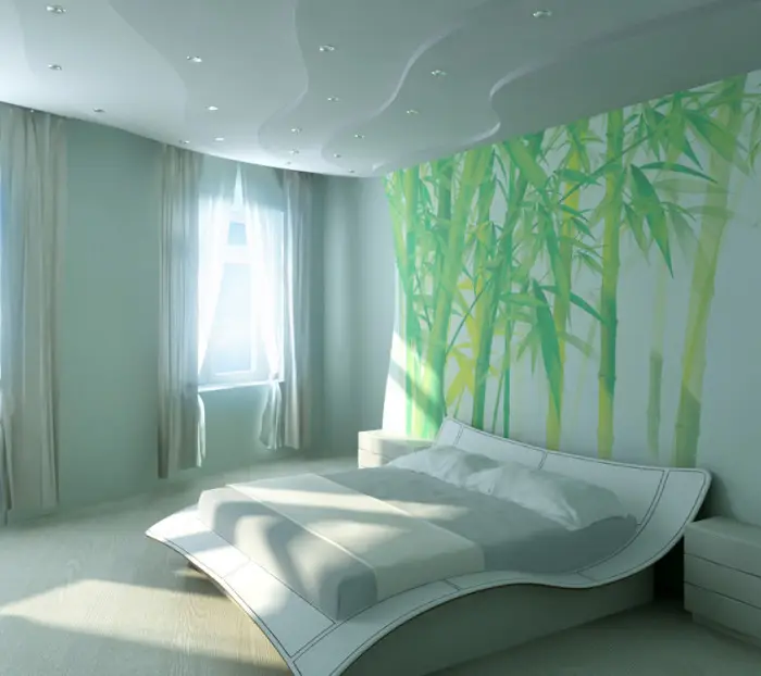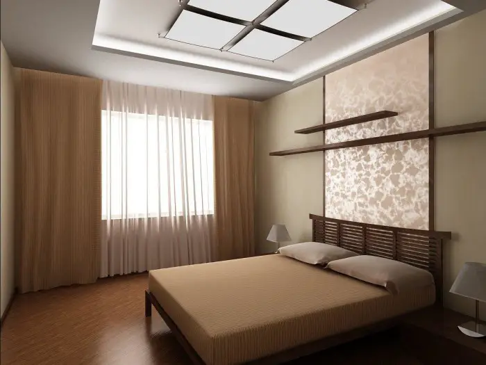 自己打造的卧室 interiors,一切并不复杂。从上图所示,你可以判断出一个普通尺寸卧室的简单而时尚设计的组成部分。带有照明的悬空天花板,墙面采用相同色调(刷漆或贴壁纸),床边墙上的一小块装饰面板,以及带有床头柜和台灯的床。这种经济实惠的选择无论是从财务还是专业角度来说,对于任何有一定装修技能和经验的人来说都是触手可及的。
