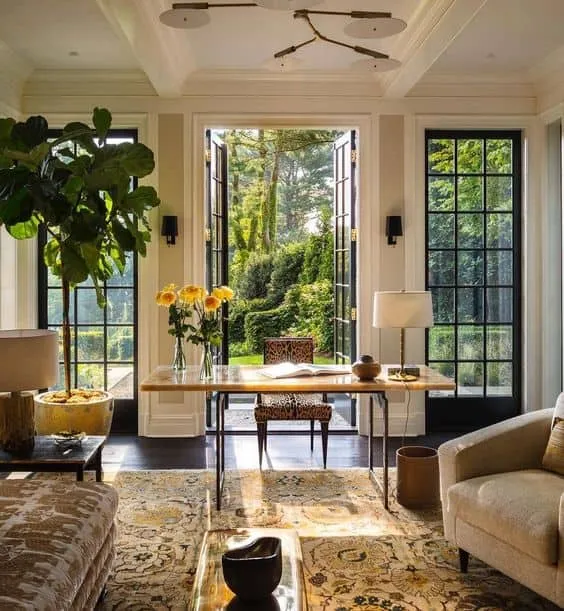 起居区设有温暖的木质地板和明亮的墙面,提供中性背景以展示线条简洁、节奏和谐的个性化家具。稍微下沉一点便进入餐厅区域,通过添加彩色和反光元素营造出现代而精致的氛围。青铜色厨房岛台与优雅的哑光漆木垂直面板相呼应,隐藏了所有厨房功能。