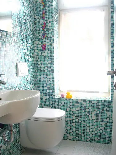 - 在浴室墙面使用彩色马赛克也会有助于视觉扩大。