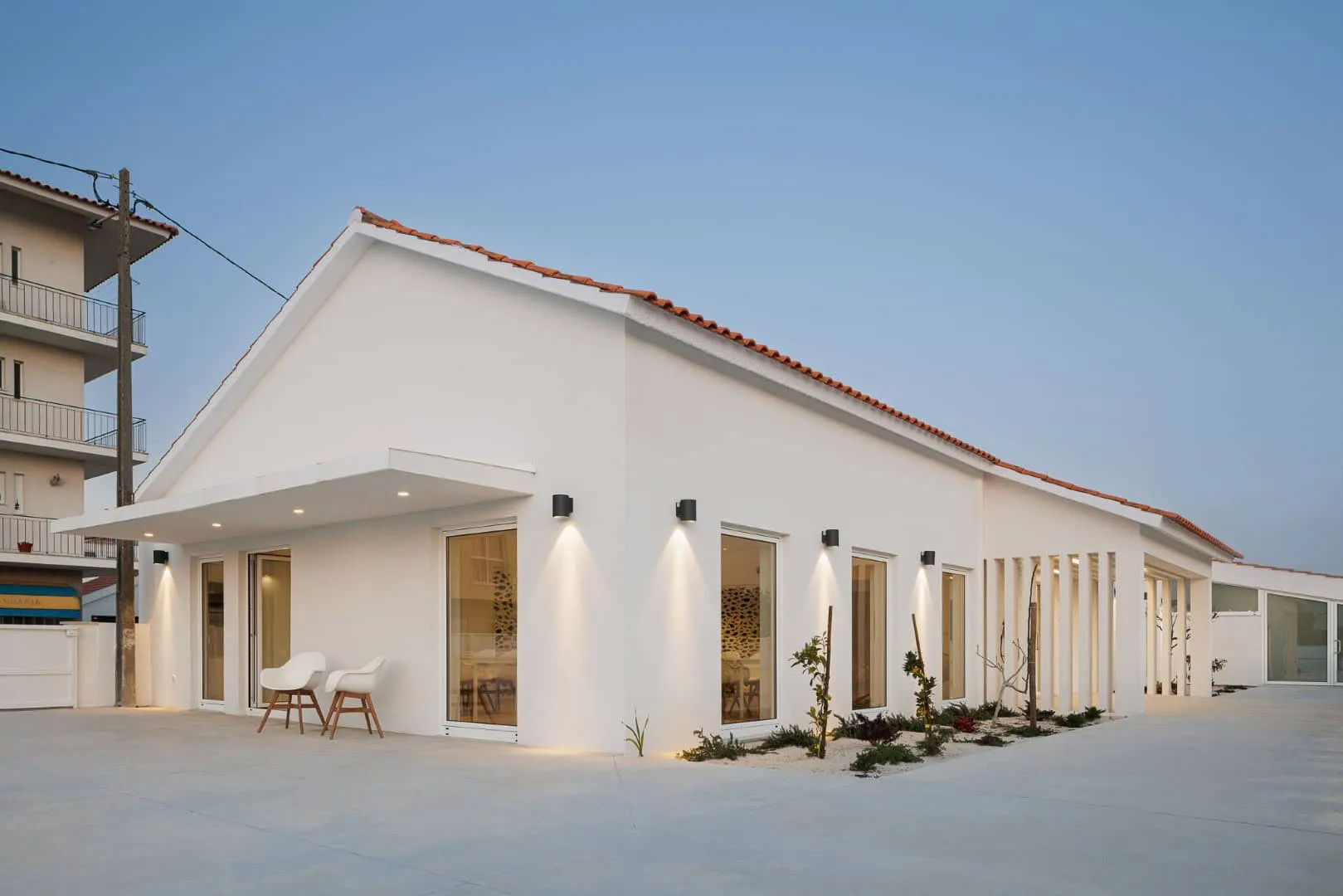 建筑采用简洁的线条和体量。外部看起来是一个整体。仅使用石头和白色墙壁作为材料,旨在简化建筑语言。玻璃楼板和栏杆加强了这一概念。