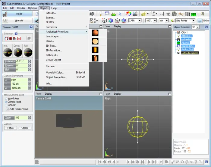 拉伸编辑器、投影编辑器、地形编辑器以及任何三维模型或动画的创建和保存支持多种格式——这些都是 CyberMotion 3D-Designer 的部分功能。您可以免费试用下载的程序 30 天以体验其功能,之后则需购买许可证。