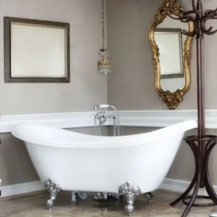 考虑将浴缸安装在非传统位置——角落或沿墙,而是在房间中央。如果直接靠墙放置对你来说不可行,请将其斜向放置在房间远角(或角落)。这种空间布局可以展示宽敞区域,进一步通过悬挂全身镜或安装镜面天花板来增强效果。