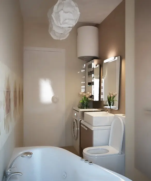 由于浴缸的非对称形状,设计师保留了房间中这一重要空间。在对面一侧,节省了一小部分空间,用于放置洗手台和一个小型存放清洁用品的储物柜。