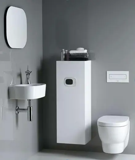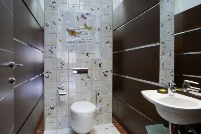 如果你的浴室不与厕所相连,那么考虑极简主义风格是值得的。在这种房间中,通常只有一块空间用于厕所、洗手台,有时还有一个马桶座圈。水表、电缆、管道最好隐藏在墙内。然而,并非必须完全封闭,因为任何故障都需要拆除整面墙。
