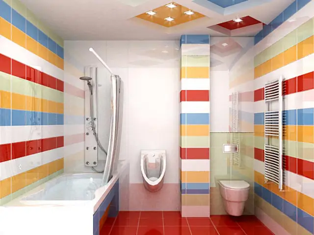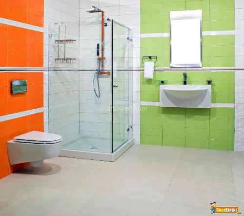 如果您想在浴室中营造欢快、夏日般的氛围,可以使用色彩鲜艳的瓷砖,如黄色、绿色或橙色来装饰墙面。