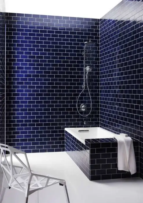 不要害怕选择深蓝色、紫色甚至黑色。它们可以与浅色的管道设备和家具搭配使用。这样的浴室和厕所设计将极其时尚且优雅。