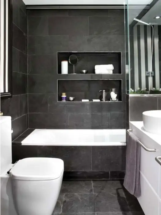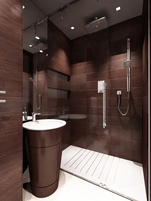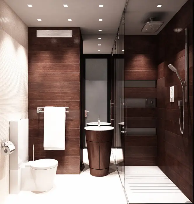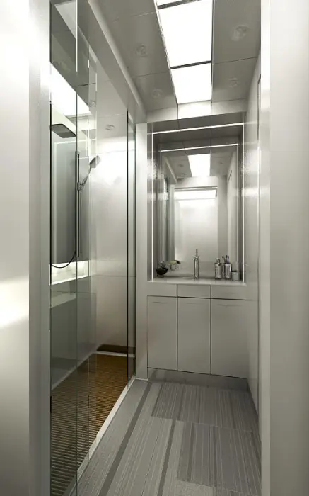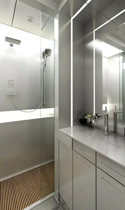 公寓式住宅(浴室)的人体工程学设计涉及更有效地利用高度空间而非宽度空间:壁挂式储物柜、卫浴设备和延长淋浴间代替浴缸,可以帮助在仅3-4平方米的空间内容纳所有所需物品。