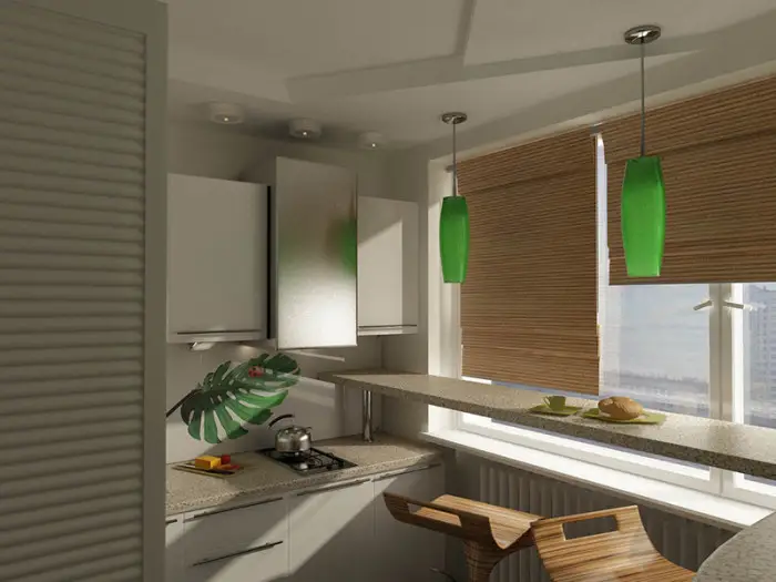 图7 — 厨房设计中的自然风格通过吧台上方的亮绿色灯光体现