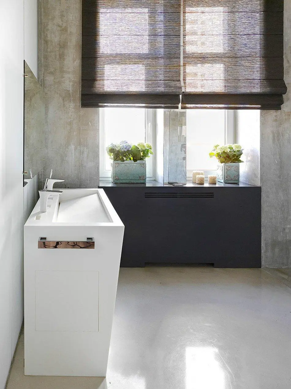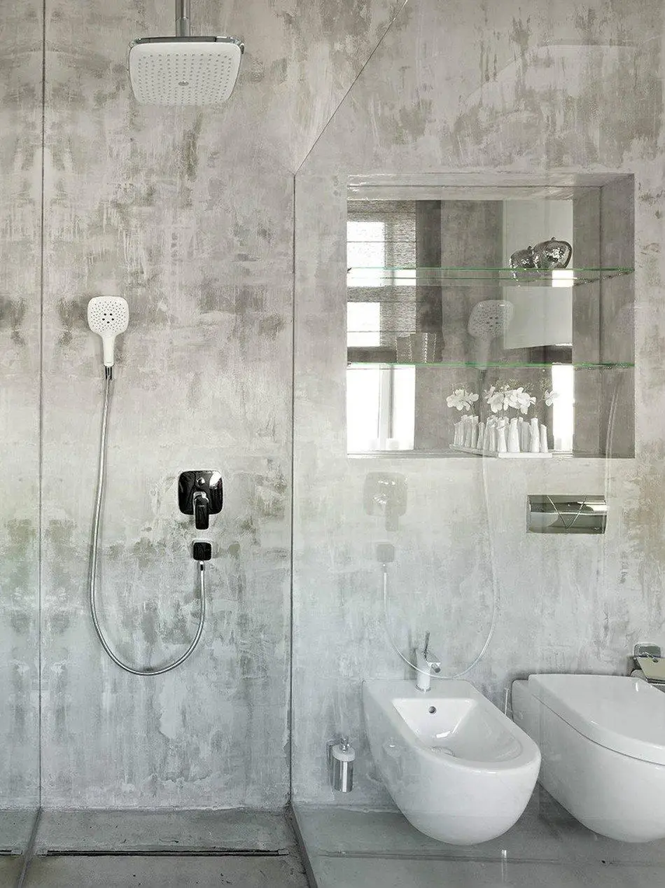 为了实现所需的轻盈感,设计师选择了简单直观的材料:仿混凝土涂料、玻璃、镜子和复合材料。这些元素的独特组合产生了预期效果——让空间显得更加宽敞。