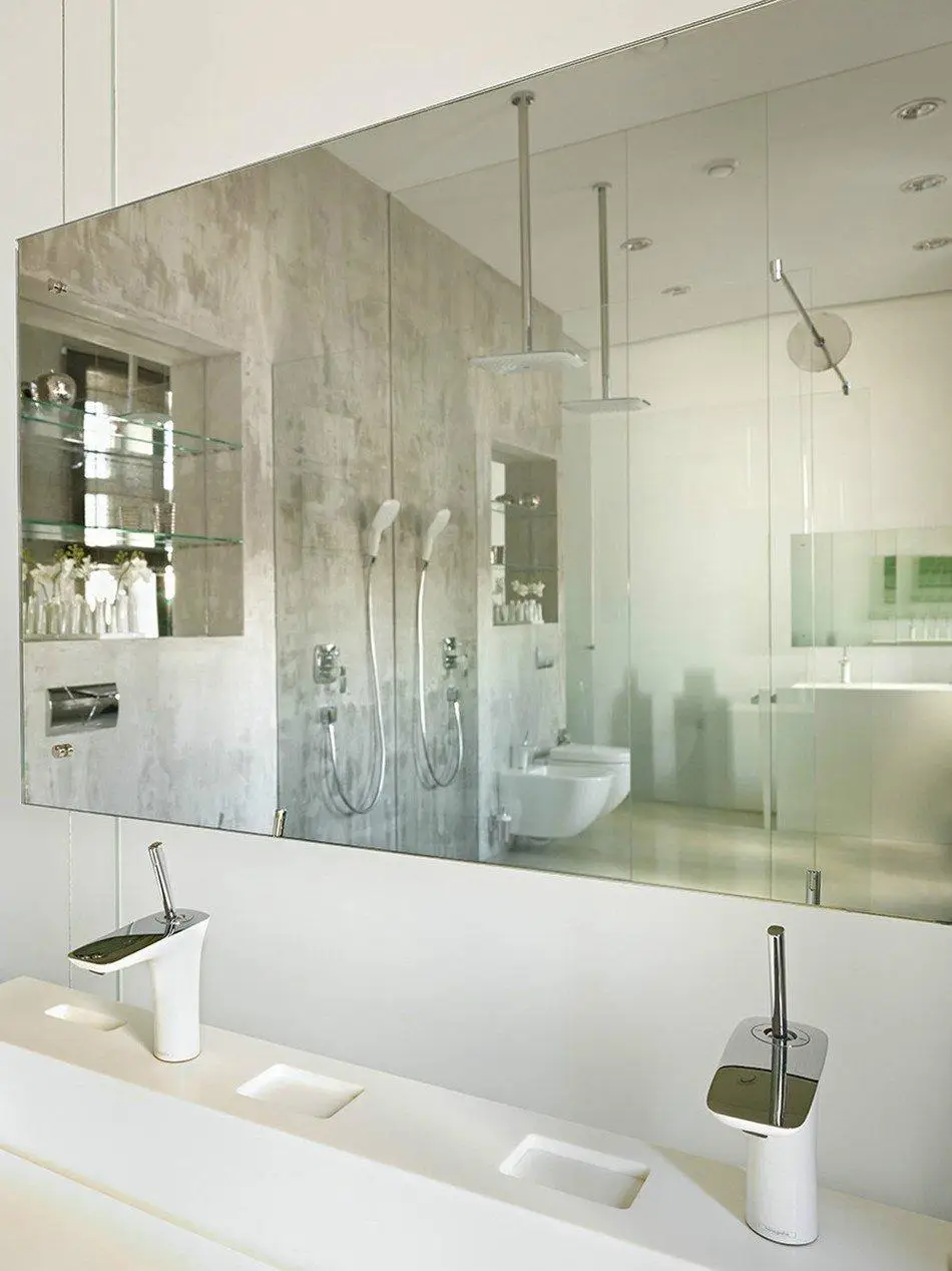 浴室与相邻卧室协调统一的色调。自然光在这个室内设计中起着关键作用。窗户透进来的光线通过镜子和光泽表面的反射得到增强。