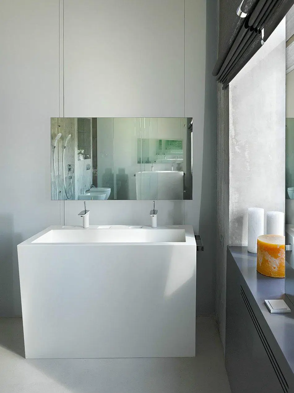 设计师选择了杜拉维特(Duravit)卫浴产品和帕特里夏·乌尔基奥拉(Patricia Urquiola)水龙头。洗手台由作者定制设计,采用科林(Corian)材料制作。