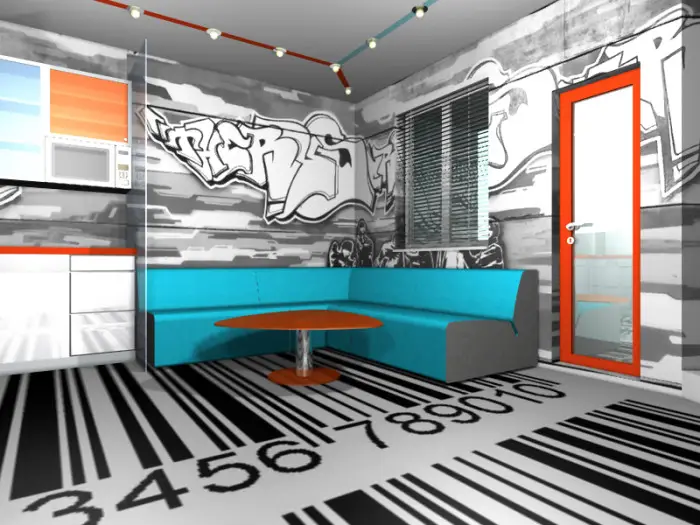 图4 — 休闲区视角。角落沙发节省空间,并利用墙面高度设置厨房柜