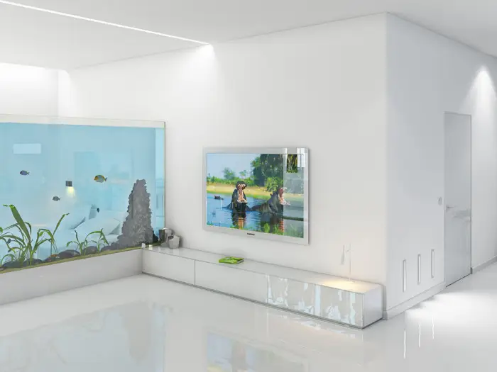 在这个公寓的内部,您找不到电视——它被投影仪取代。如果您无法摆脱新闻、电视剧和足球比赛直播,我们建议将普通电视替换为悬挂系统,并将“盒子”安装在墙上或天花板上。