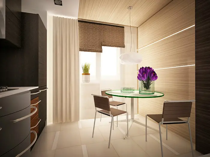 重新规划后,公寓中的一些房间变得狭小而狭窄。为了在视觉上扩展空间,使用了浅色天花板饰面和反光表面——光泽面板、镜子、马赛克。这些墙面和家具覆盖物不仅提供了更多光线,而且无意中创造了反射迷宫,也让人感觉空间更大(见下图)。