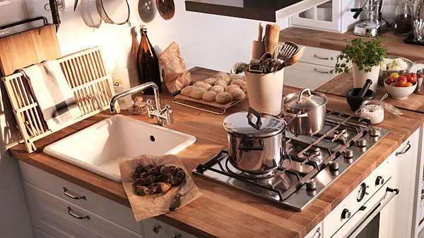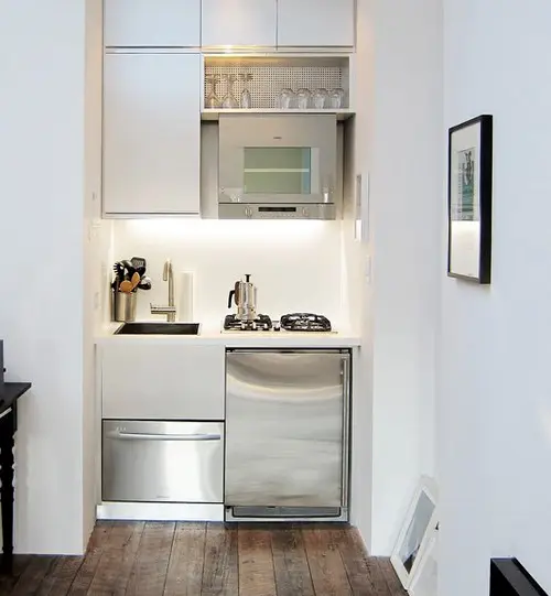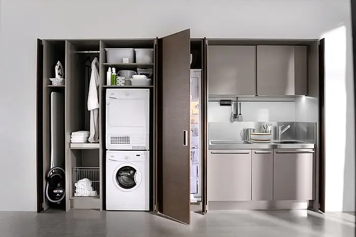 - 电器越多越好。然而,要明智选择。例如,用3或2个炉头的炉灶替代4个炉头的炉灶。用紧凑型水槽替代笨重的水槽(带过滤器——这是必需品!),并选择内置洗碗机,可以像洗衣机一样放入其中一个柜子中。
