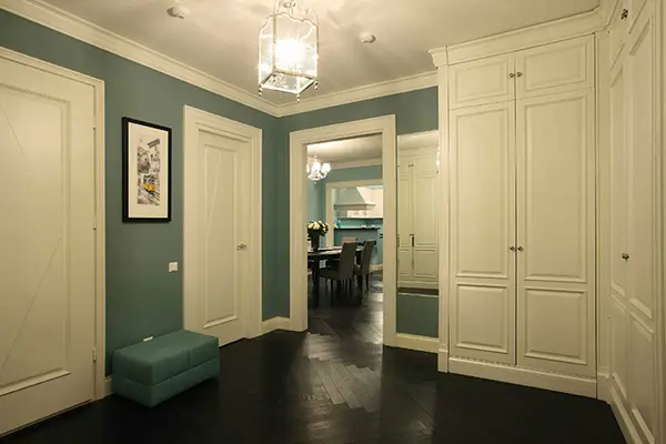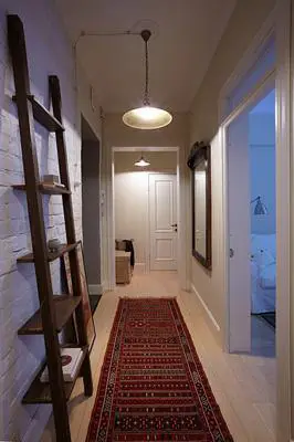 此类过道和入口的装修与室内风格应尽量保持一致。或者通过家具将入口区域从房间公共区域中分离出来。例如,可以在过道放置一个衣柜,但不要将衣柜的侧板紧贴着门边墙,而应离门约50厘米。这样会自动形成一个存放外套和备用鞋子的角落。