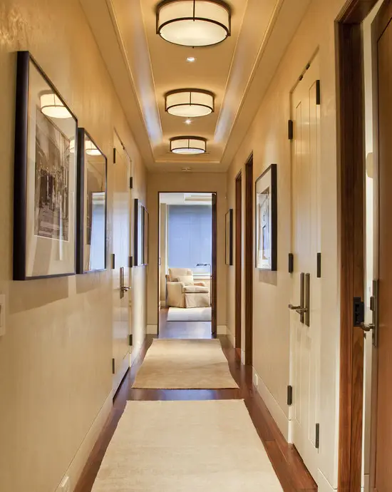 在这样的空间中,对称看起来非常完美:我们通过门框装饰来强调过道的矩形形状和所有可用空间。记住室内设计的黄金法则:从过道可见的所有通道必须一致地装饰,不偏离所选风格。如果墙面某段至第一个门洞开口为空,则应挂一面与门框相似的镜子。结果是一个简单而时尚的室内设计。