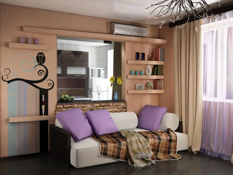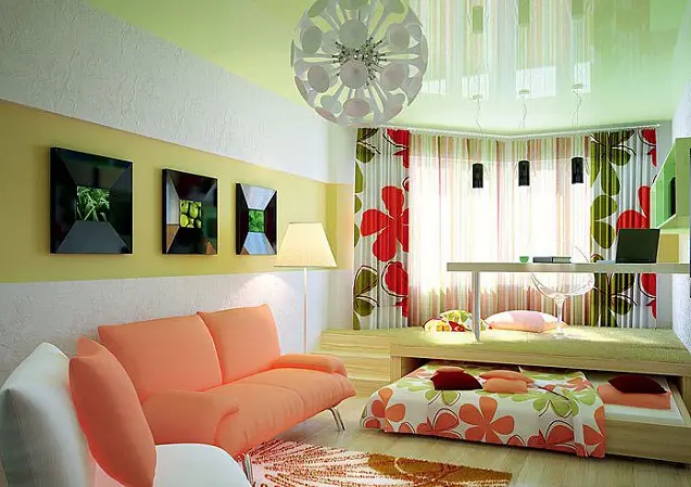 其次,将图案壁纸与素色壁纸、浅色与深色饰面、不同质感、淡色背景和明亮装饰相结合,可以创造出独立的舒适区域。但应避免过度使用鲜艳饱和的颜色——考虑到该空间同时也是卧室,建议选择更柔和的色调。