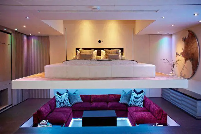 第三,天花板与地板的设计可以作为睡眠区和休息区之间的自然分界(对于足够大的房间,可在天花板上设置石膏板结构,在地板上设置台阶或平台)。