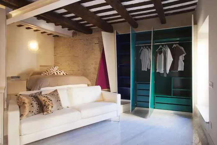 首先,如果空间较小,最好避免使用全尺寸床,而是选择一款好的沙发床或可折叠床,能收纳进衣柜中。这样既便于舒适睡眠,也易于转换为客人用具或腾出空间。衣柜和书架可以嵌入壁龛中。