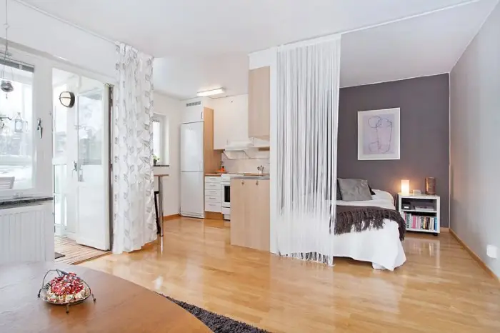 其次,如果房间足够大,可将两个独立区域分开,使用宽大的衣柜、滑动隔断或布艺窗帘。