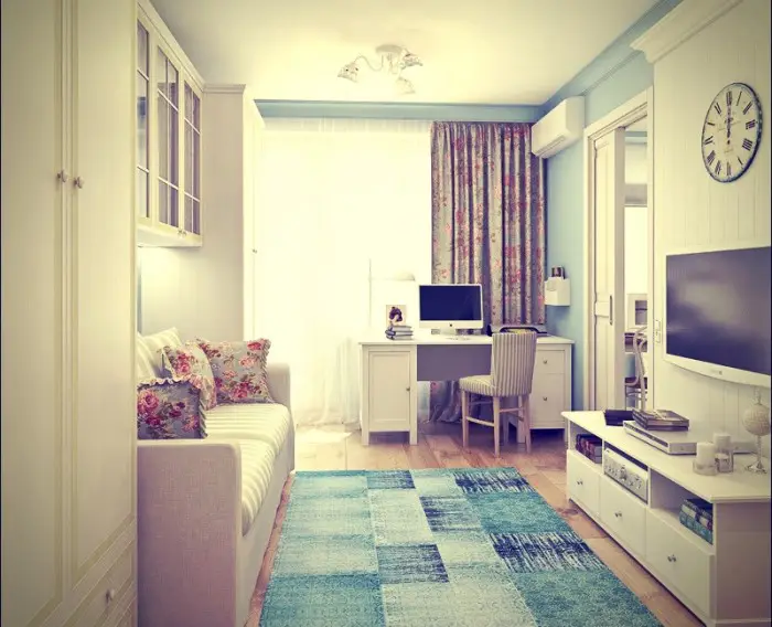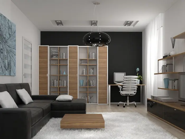在墙面装饰材料方面,选择可以非常多样化。然而,建议选择柔和或中性色调的壁纸或纹理涂料。明亮的颜色可以用于突出一面墙或作为装饰——如靠垫、纺织品、画作。考虑到所有可能的活动和放松都会在一室中进行,过于饱和的墙面色彩不会有助于良好的工作或休息。