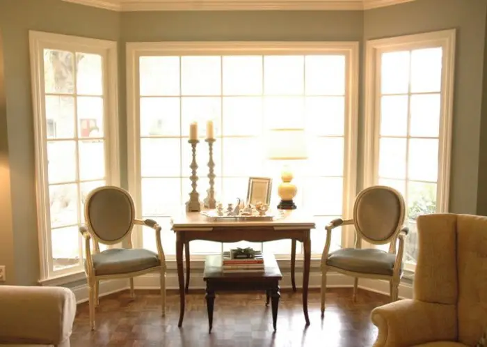 - 茶区。在凸窗中放置一个大的餐桌几乎不可能,但一个小边桌和两把扶手椅肯定可以。一个舒适的角落,一杯茶,一场真诚的对话。