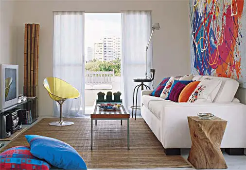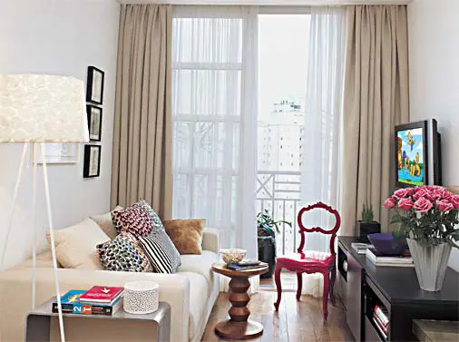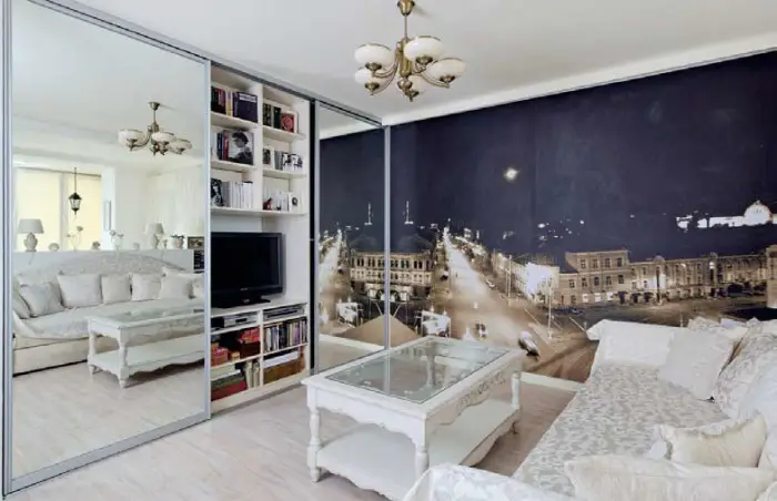 走廊布局的优点是通常有一扇大窗户占据大部分墙面。半透明的窗帘将强调客厅的这一特点并柔和地扩散光线。一个带有镜子或有光泽隔断面向窗户的客厅可以设计成任何风格。毫无疑问,它最适合现代室内设计。客厅可以与厨房合并,或者布局无需更改。