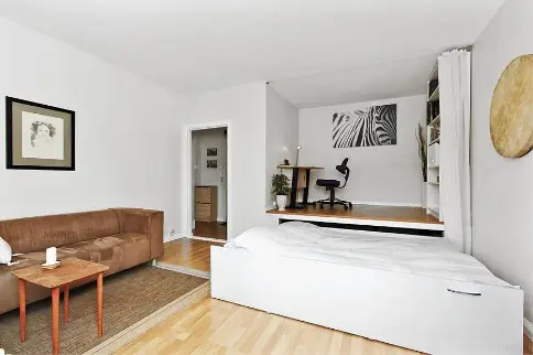 为了最大限度地减轻单个房间的负担,衣柜可以放置在走廊里。在一些较旧的布局中,入口处有一个带储物空间的壁龛,可以被内置衣柜取代。旧阁楼也不应被忽视。通过部分解决物品储存问题,可以继续选择睡眠空间。传统上,在单间公寓的客厅中,有一张沙发床。更原创的解决方案——例如,平台床。空间并不拥挤,客厅仍然是客厅,但它有两个层次。睡眠空间隐藏在一个约40厘米高的平台上,可以在那里放置客人或工作区域。