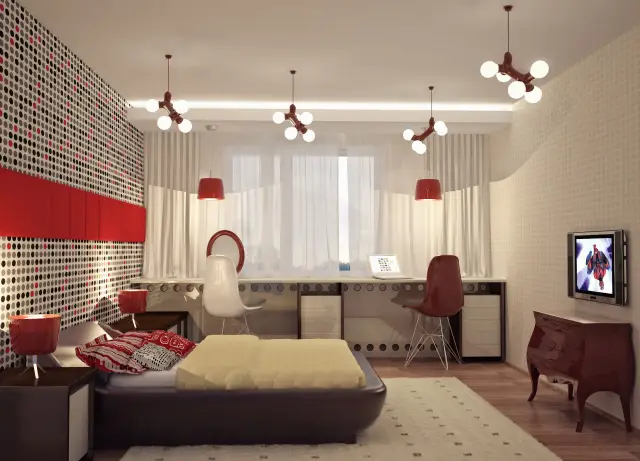 关于成人卧室(如下图所示),它也并未避开鲜艳的色彩。然而,就像客厅装饰一样,鲜艳的点缀色(红色)仅用于一面墙,房间通过柔和的米色色调和柔和的照明平衡,稍微减弱了对面墙的光泽。