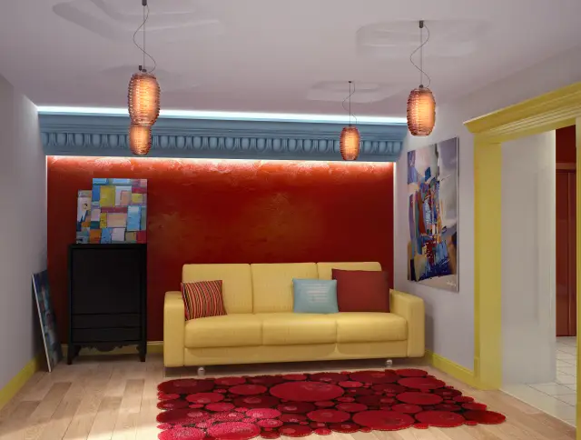 图2 — 注意颜色搭配。红色纹理墙面与蓝色檐口上的背光突出了柔和的黄色沙发和同色的踢脚线