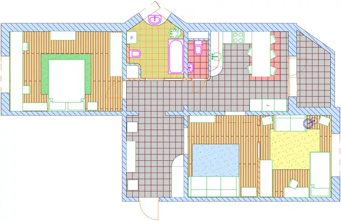 为了在家中营造舒适氛围,设计师和心理学家通常建议在室内设计中避免使用鲜艳的颜色:要么将自己限制于明亮的点缀色,要么使用柔和的色调。我们为您呈现一个两居室公寓的设计方案——这是所有可能规则中的独特例外:它不仅是一种大胆的色彩解决方案,而且是对标准“两居室”公寓的非传统重新配置。